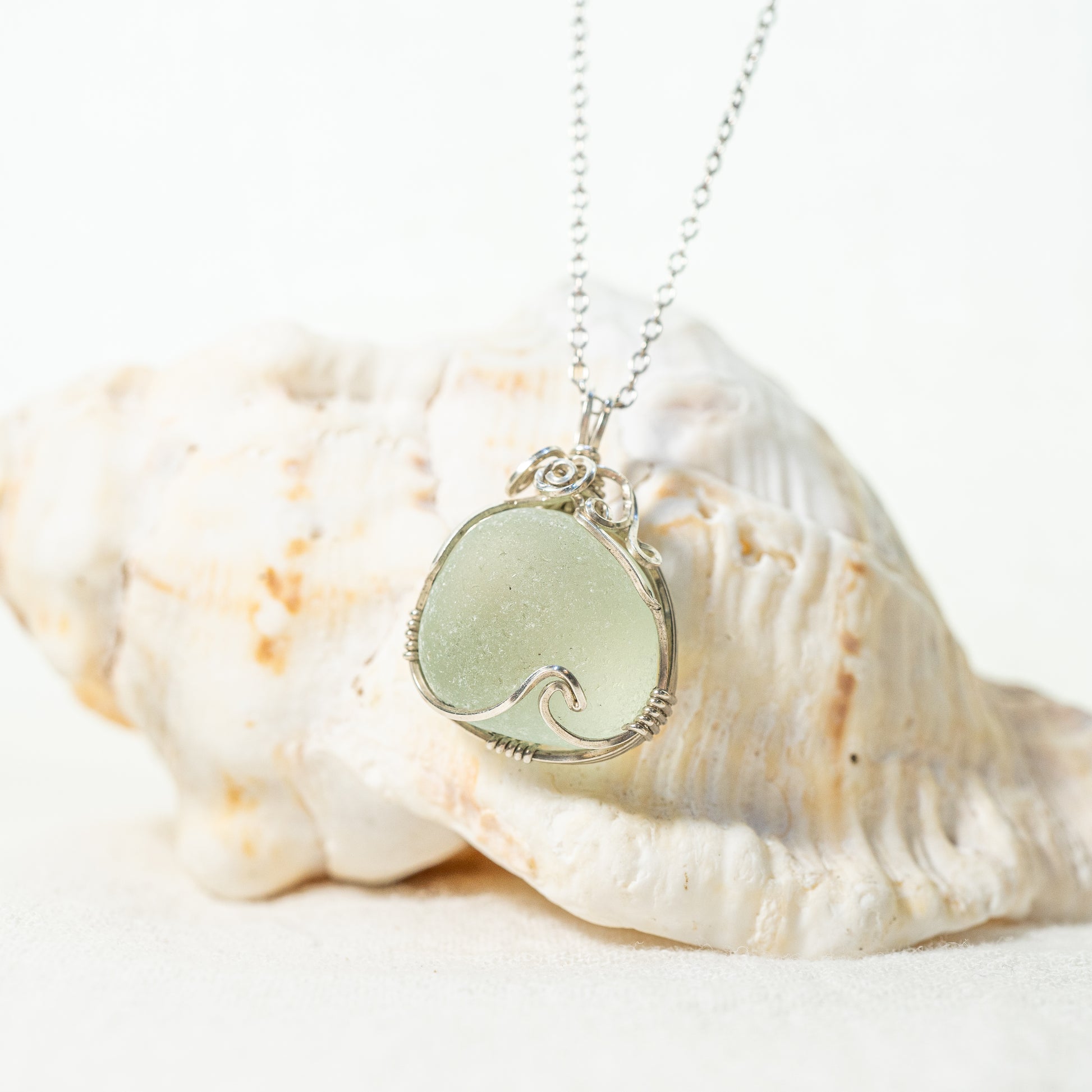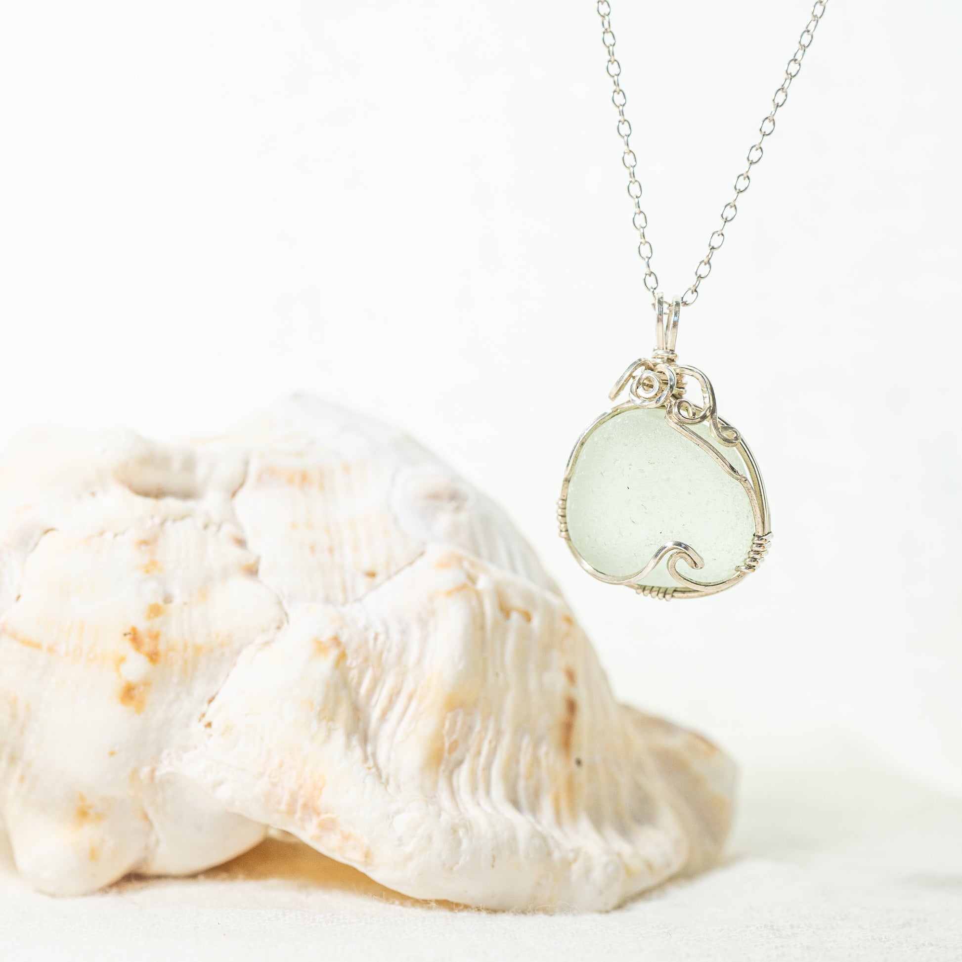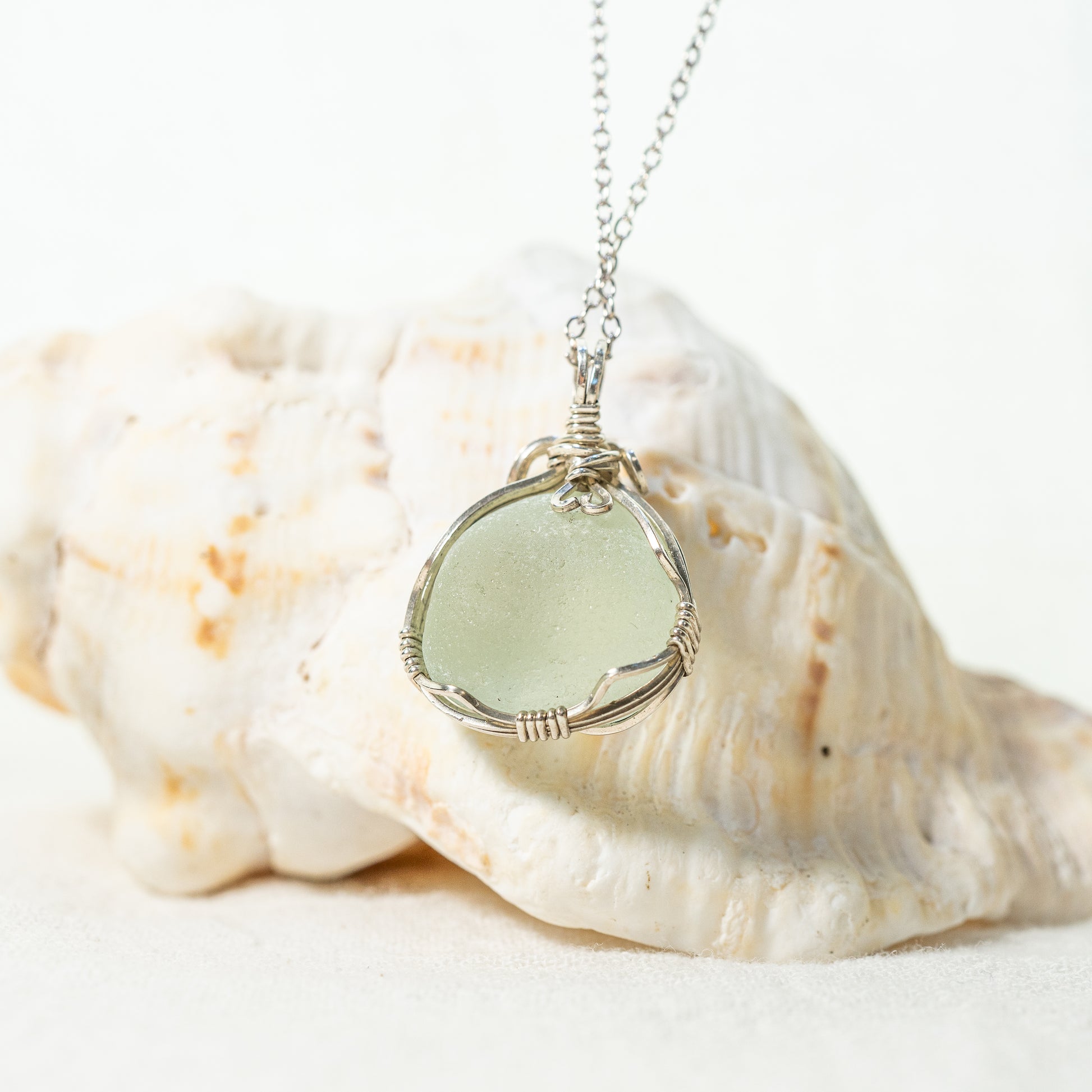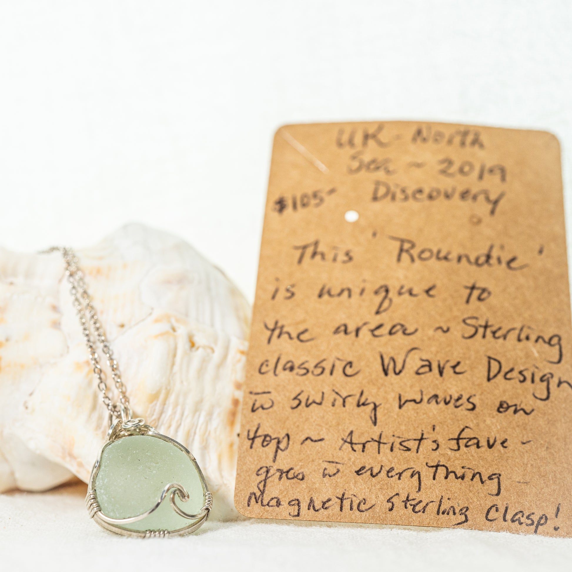 Perfect round weathered sea glass from the UK/ North Sea with classic hammered wave. Reversible sterling silver wire wrap.
