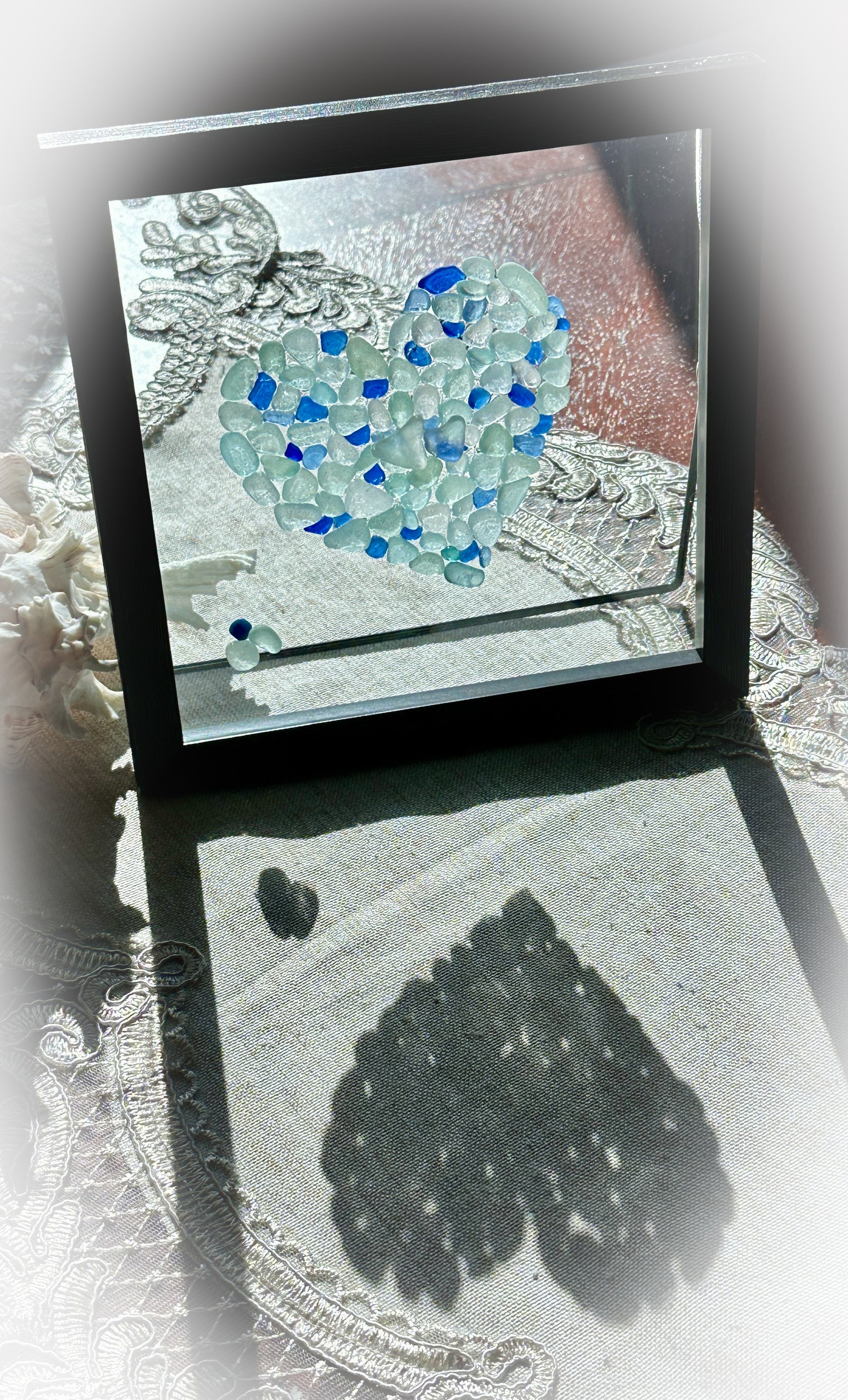 Sold! Contact for a custom one! Whimsical heart in rare gorgeous ocean blues! These special 'littles' were found in Northern California and in the UK! Countless hours of sifting through bits of pebbles, shells and sand were needed to discover these elusive well tumbled pieces. Very worn chards of old seafoam coca cola bottles, blue Noxzema jars, and lighter blue Milk of Magnesia bits are likely the origins.